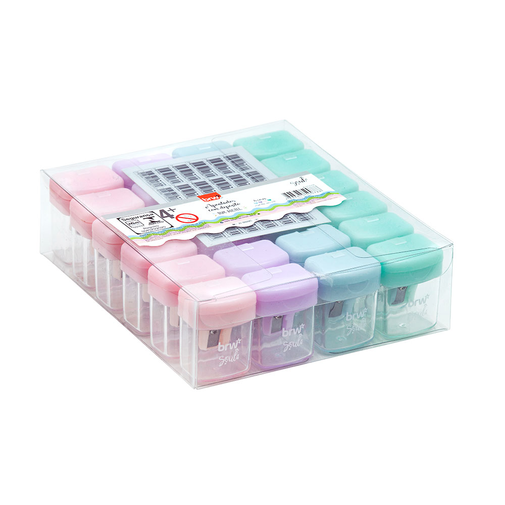 Apontador disponível em 4 cores pastéis: rosa, lilás, verde e azul.