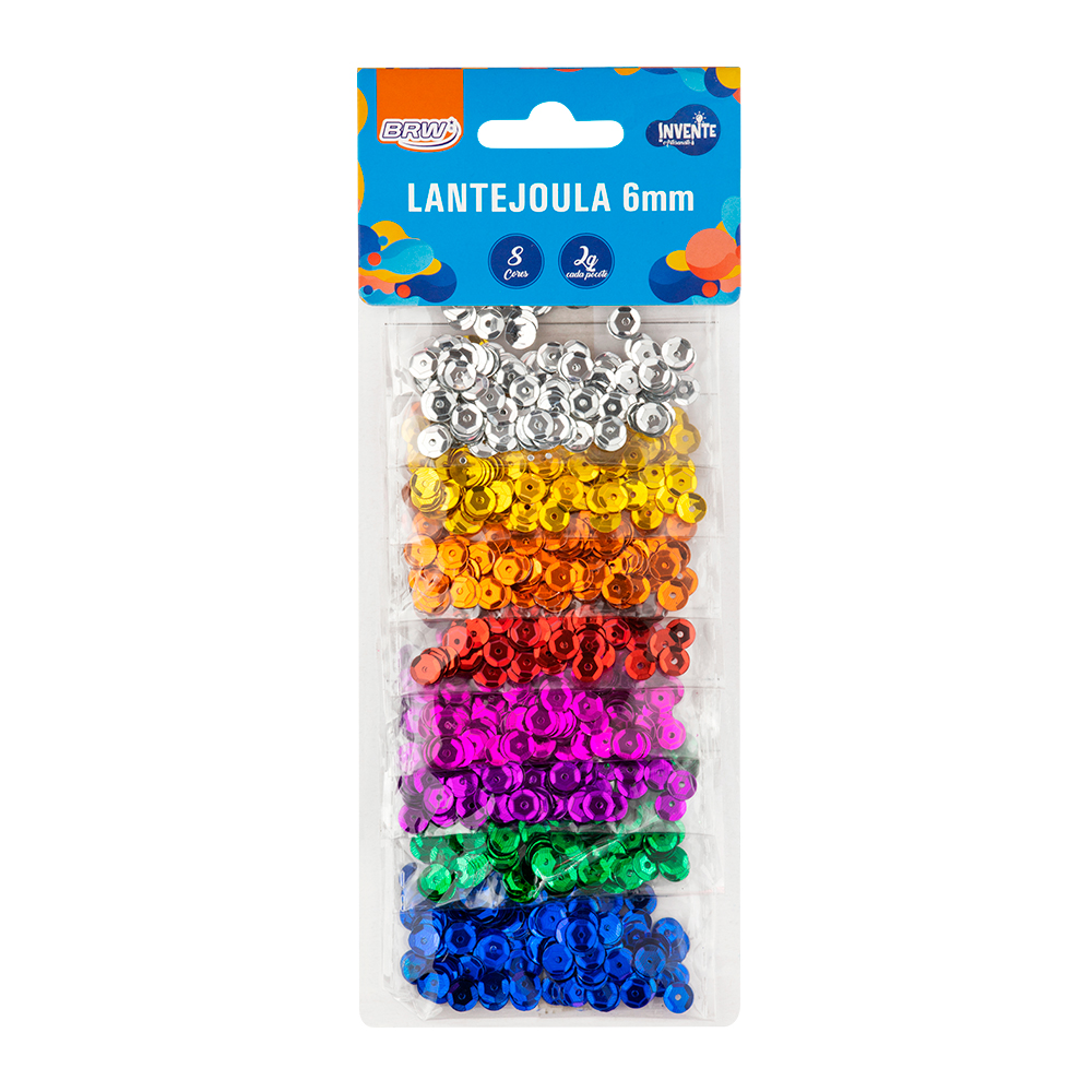 Lantejoula 6mm Brw, ideal para trabalhos manuais e artesanatos. Contém 8 cores de 2g cada. Composição: Pvc e pigmentos.